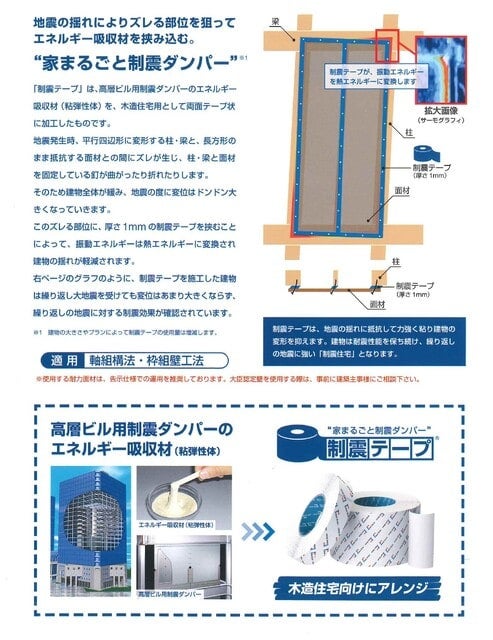 制震テープは、高層ビル用制震ダンパーのエネルギー吸収材(粘弾性体)を木造住宅用として両面テープ状に加工したものです。