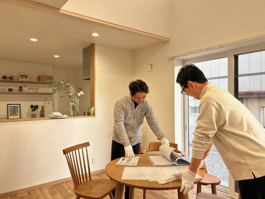 施工を担当した井上建築工房の井上社長、断熱気密アドバイザーの菅原さん(株式会社たがめ)は半日でしたが、接客対応していただき、それぞれの立場から専門分野について解説していただきました。大変心強く、頼もしかったです。