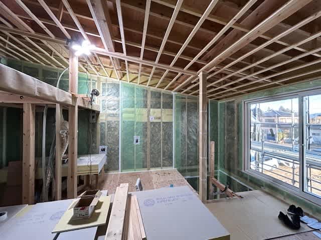 断熱性能は、壁をGW100㎜+EPS100㎜、天井はGWブローイング400㎜。