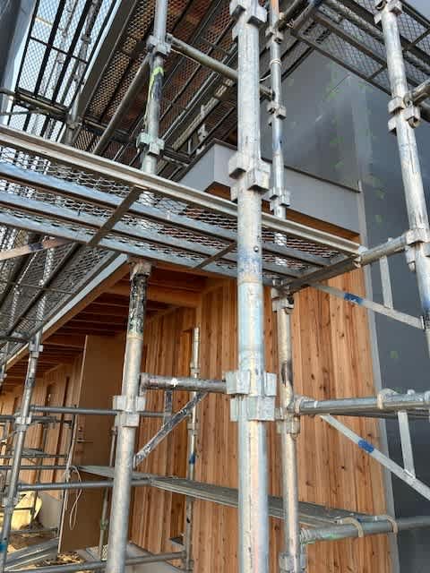 片流れ屋根で南側には大きな開口部が4か所、1階部の外壁は杉板を利用していて…。