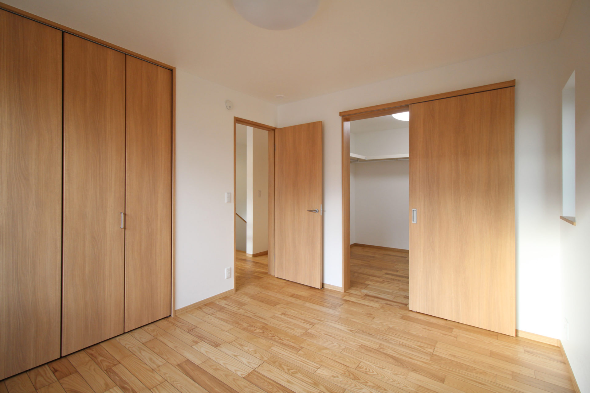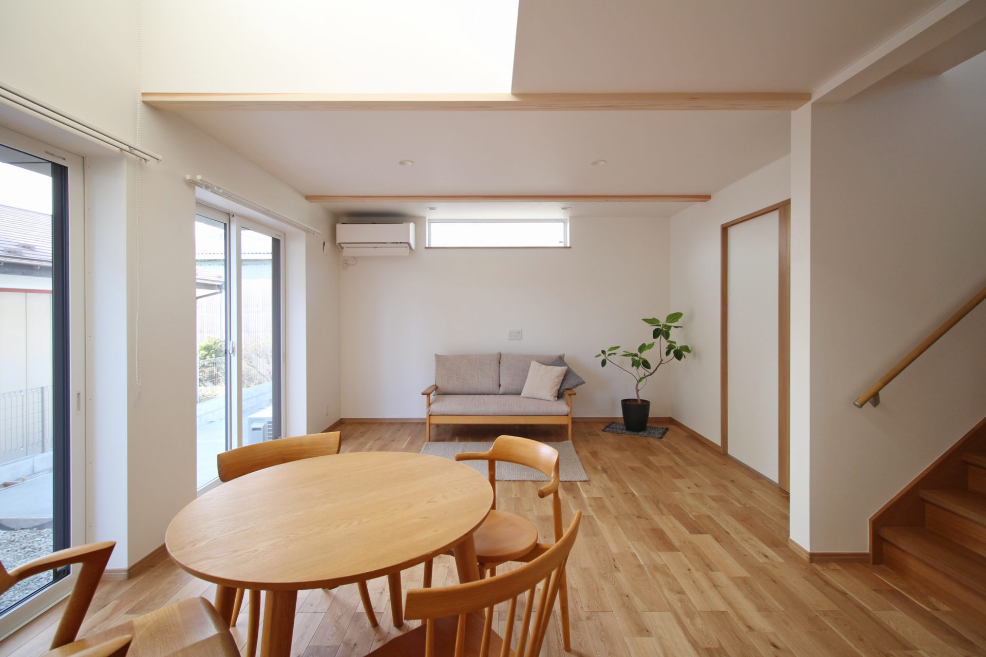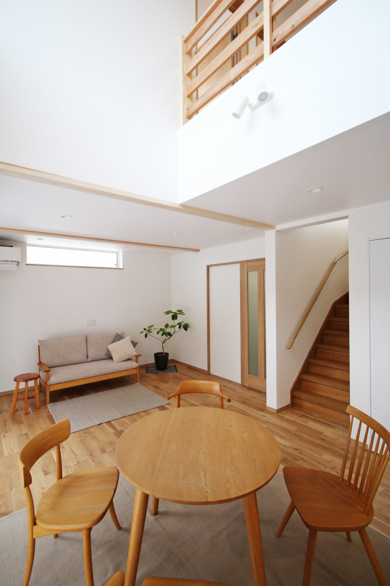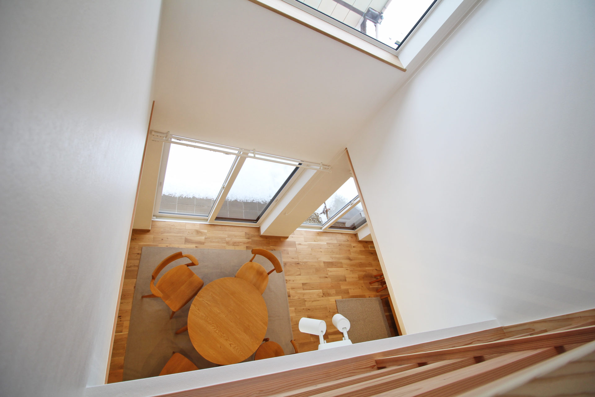 家の中心に吹き抜けを設け、そこにつながるように各部屋を配置しました。開放的な吹き抜けの窓から入る日差しは、冬には暖房エネルギーとしても活用できます。