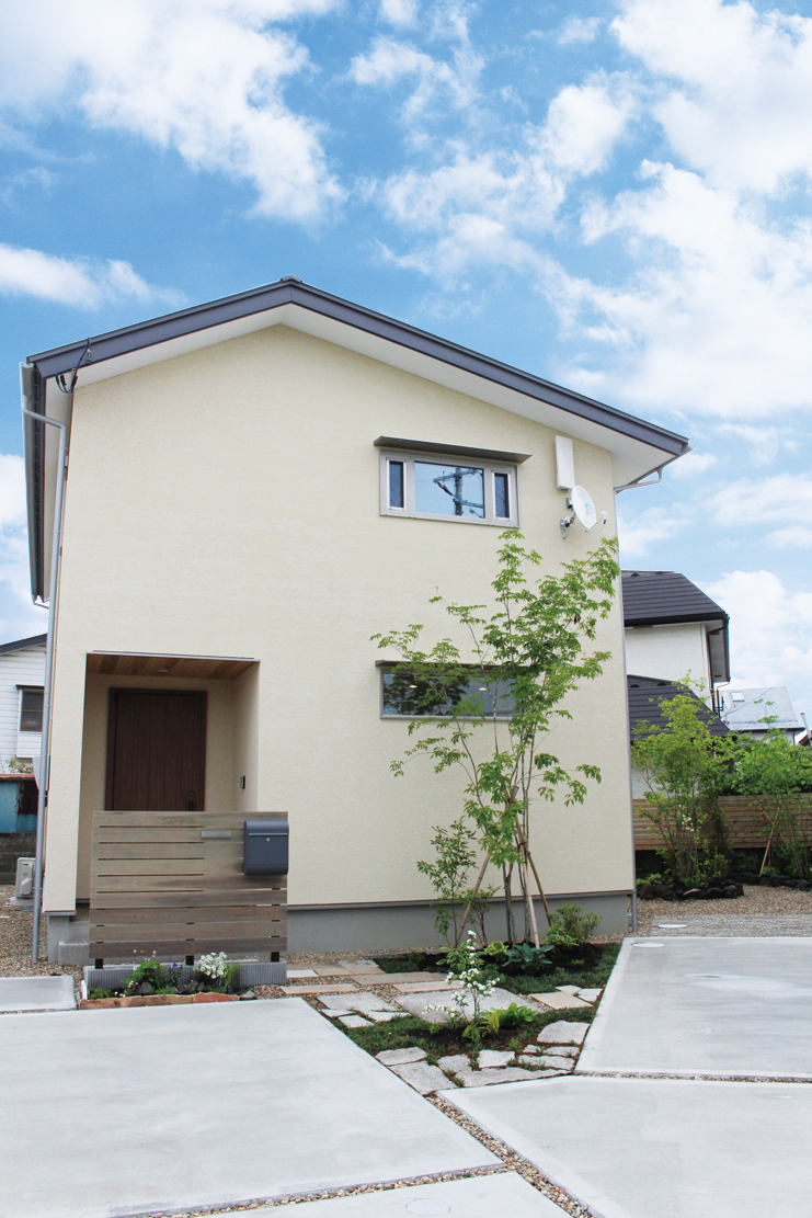 性能の知識に長けた施主様と幾度と協議し、標準仕様よりも上のレベルUA値0.28を実現、造作のベンチ収納や小上がりの畳室のリクエストに応えました。明るく開放感のある空間と自然素材に囲まれ、まるで家の中で森林浴をしているようです。玄関前のアプローチには素朴な素材を使い、室内から見渡せる庭も相まって建物と敷地全体が調和した住まいになりました。